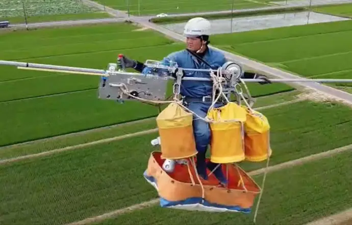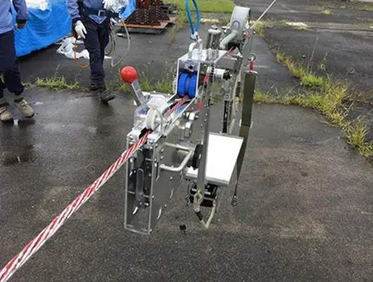 操作方法 宙乗機に連結させ牽引し、装置本体のレバーを引くことでSRリングを電線へ取り付ける。