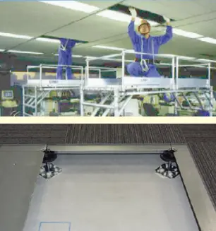 - OAフロアは躯体上に空間を設ける床部材で、システム天井は天井懐を設ける部材です。古いシステム天井は耐震補強材が未設置です。