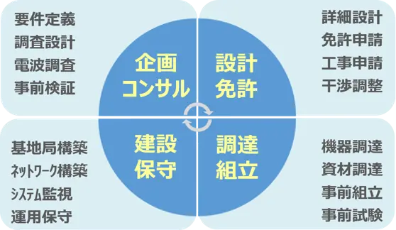- 企画から設計、免許、調達など、導入からその後のメンテナンスまでをTotal Build & Support