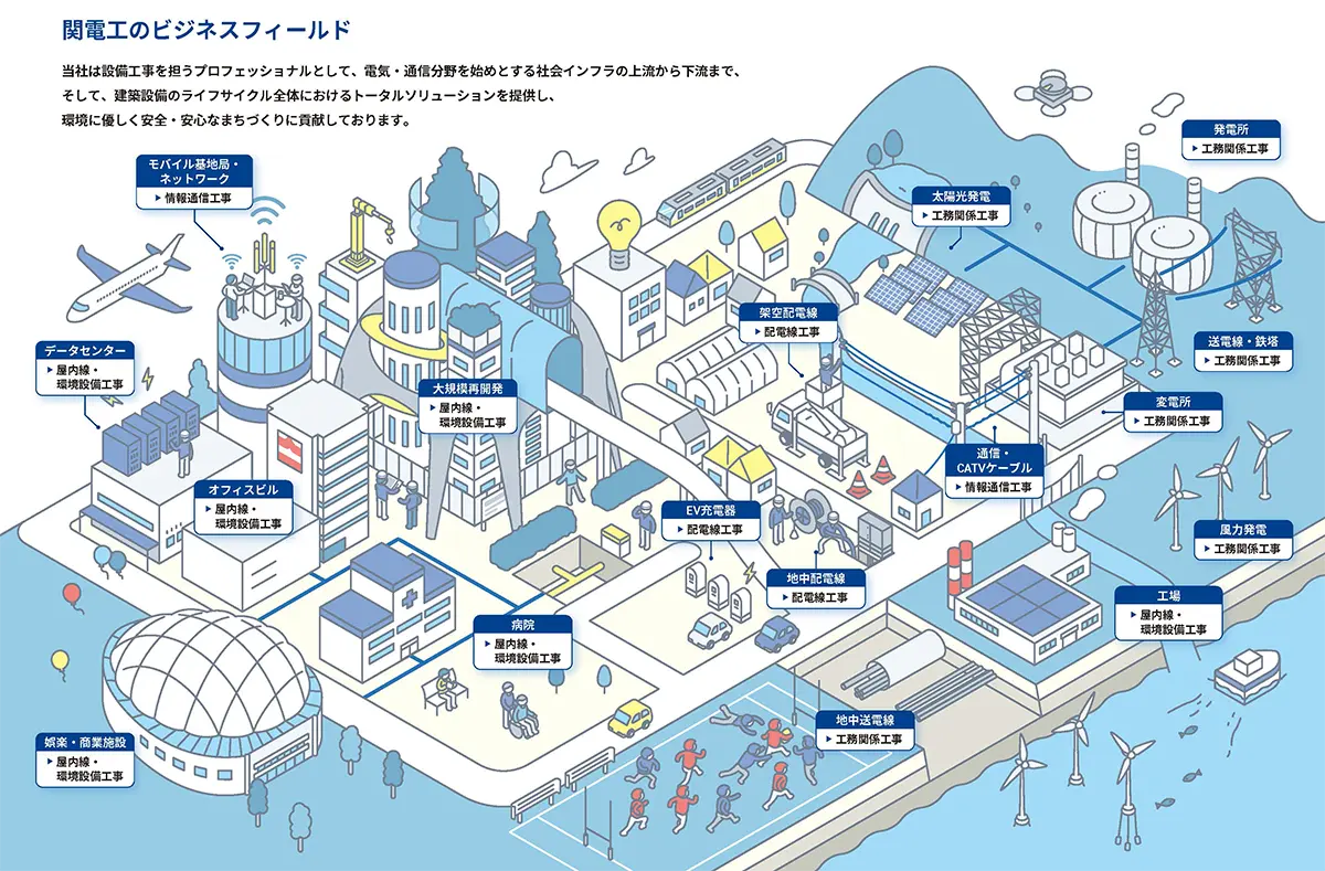 オフィスビル、工場、ホテル、商業施設、教育施設、病院など、国内外のさまざまな建物における電気の新設・増設を担っています。また、既存設備のリニューアルにおいても、設備診断から企画・提案・施工・保守・メンテナンスに至るまでお客様のあらゆるニーズにお応えします。