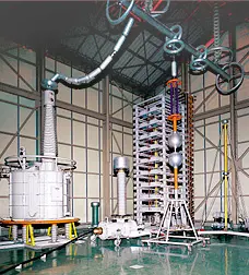高電圧研究室は、試験室、物理試験室、作業室、耐電圧試験用の屋外水槽から構成されています。試験室には、350kV交流電圧発生装置、1800kV衝撃電圧発生装置、大電流発生装置など大規模な実験装置が設置されています。