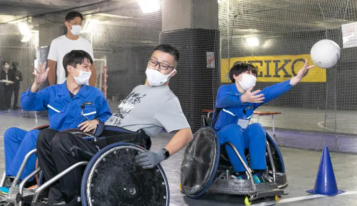 車いすラグビーでは、元日本代表選手の三阪洋行さんから競技の特徴やルールの説明を聞いた後、メンバーが競技用の車いすに乗り、操作やタックルを体験。