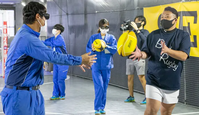 ブラインドラグビーでは、現役選手でキャプテンを務める神谷考柄選手を迎え、視覚障がいの体験ができるメガネを装着し、歩行やボールの受け渡し、走りながらのパスの練習を行いました。