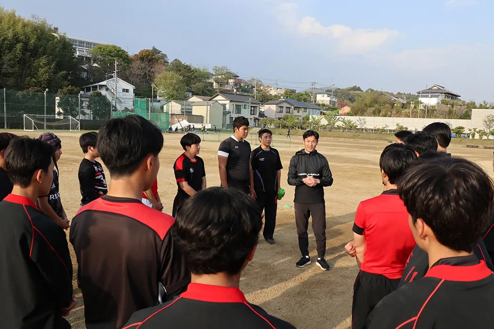 当日は、新学期のスタートに合わせて多くの1年生が見学・体験に訪れ、活気あふれる時間となりました。2・3年生からは、「ラグビーが難しい」「チームをまとめるにはどうすればいいか」「部活と勉強の両立に悩んでいる」といった多くの相談が寄せられ、廣瀬CCCが一人ひとりに丁寧に向き合い、アドバイスを送りました。