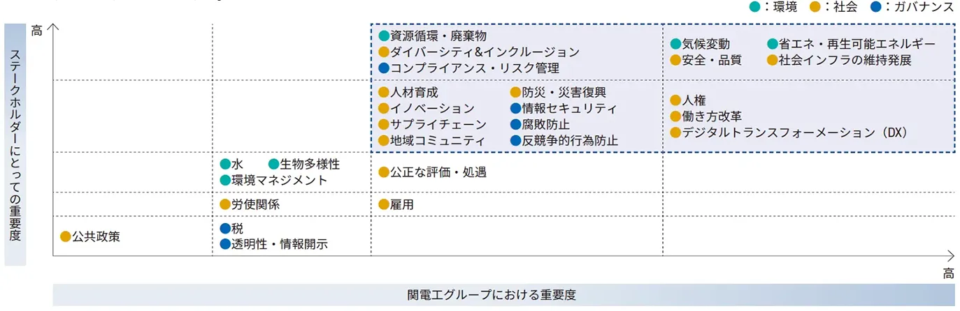 STEP 1 で抽出した社会課題について、「ステークホルダー(社会)にとっての重要度」と「関電工グループにとっての重要度」の2つの視点から重要性が高い課題を特定しました。