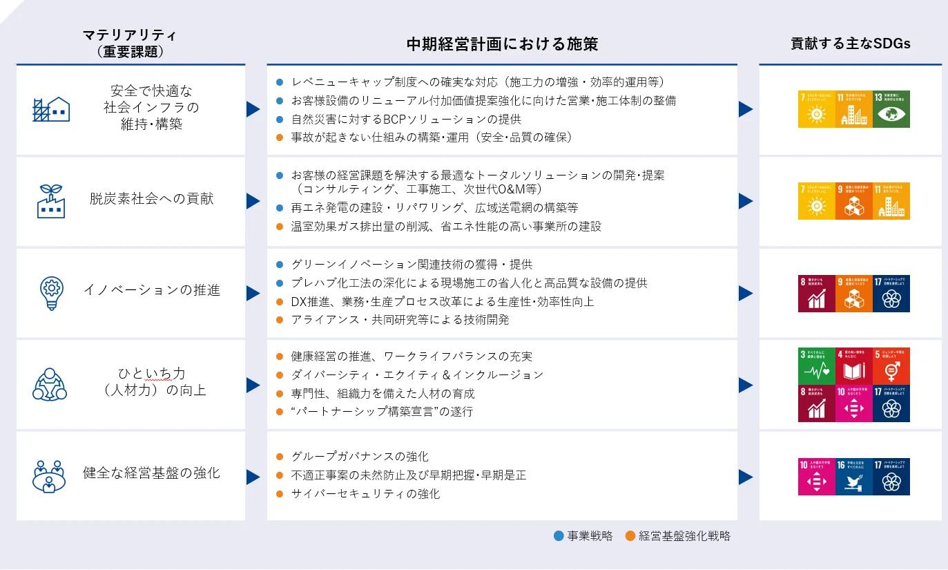 関電工は、社会課題を客観的に認識したうえで、サステナビリティの観点からリスクと機会の分析をおこない、5つのマテリアリティと18のサブマテリアリティを特定しました。
