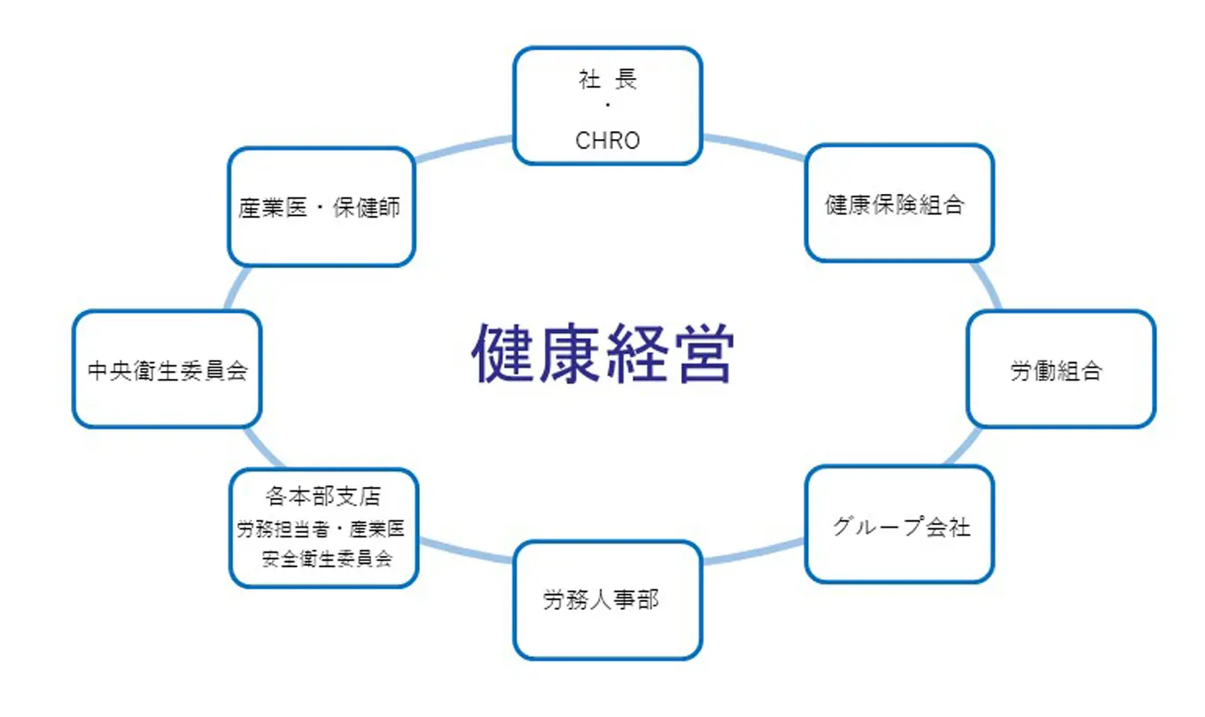 関電工では、社長を健康経営の最高責任者とし、各本部・支店、関係部門、産業医・保健師、健康保険組合、労働組合が一体となって健康経営を推進しています。