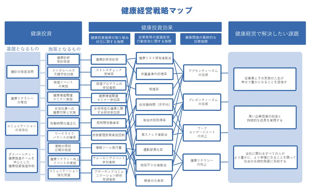 健康経営で解決したい課題、期待する効果、具体的な取り組みの繋がりを図示した「健康経営戦略マップ」に沿って、健康施策に取り組みます。