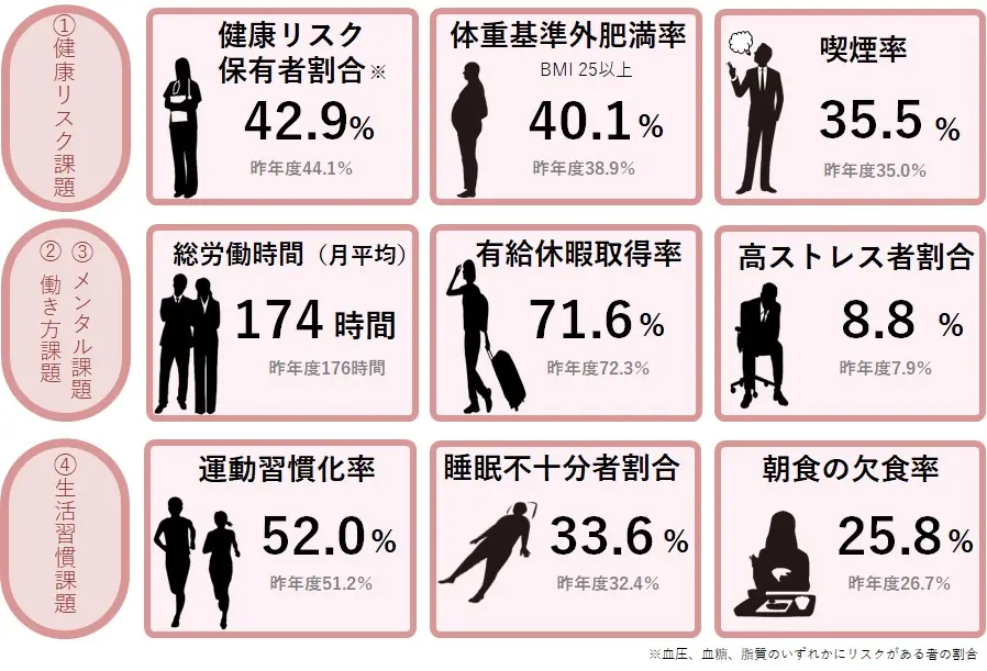 従業員の健康診断結果、働き方データ、ストレスチェックを分析して、9つの健康課題を抽出しました。この数値をKPI指標と位置付け、改善施策を実施し、効果測定を行います。それにより、従業員の健康状況の確認と健康意識向上の進捗度を測ってまいります。